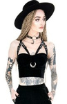 Black gothic top with a moon. Made of black velvet and vegan leather. Bust cups are shaped and filled with foam. A meatl moon decoration between the cups.Double arm straps with buckles are totally adjustable. Hidden zipper. Fabric slightly streches.