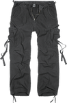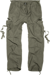 Kultowe M65, postarzane bojówki o luźnym kroju, styl vintage, niemieckiej marki Brandit. Kieszenie zamykane na zatrzaski - na nogawkach, z przodu i z tyłu. Regulowany obwód pasa (paski na bokach). Sznurki do ściągania przy nogawkach. 100% bawełna.
