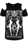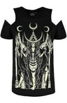 Black gothic women's t-shirt, has a fitted cut and a tailored cut with cold shoulders. 100% Cotton. The graphic on the shirt shows the goddess Hecate. Hecate Trivia, or Hecate of the Crossroads, is a woman with three faces (and bodies).