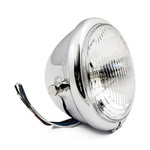 Fits to: Universal. Chrome plated aluminum headlight with an elongated headlight shell, ECE approved lens, H4 bulb.