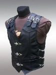 Motorcycle vest made of high-quality impregnated thick cowhide. Perforated lining. YKK zippers and press studs. 2 outer pockets, and 2 internal ones additionally fastened with zips. The vest is tied and adjusted on the sides with 3 buckles.
