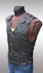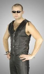 Motorcycle vest made of high-quality impregnated thick cowhide. Perforated lining. YKK zippers and press studs. 3 outer pockets, and 2 internal ones additionally fastened with zips. The vest is tied and adjusted on the sides with leather straps.