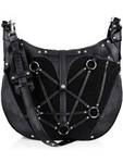 Pentagram hobo bag made of solid, black jeans and faux leather decorations. Long, adjustable and detachablearm strap. Inside there is black ,soft lining with 2 pockets. Big zipped one and other smaller one. Size: high: 28 cm, lenght: 44 cm.