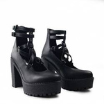 Black feminine platform shoes made of high quality vegan leather. The sole hight approx. 6 cm (front-back). Polish production. The highest quality of materials and workmanship guarantee long and comfortable usage.