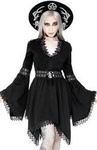 Gothic dress with a pentagram, peplum, and lace. Entirely made of black, strong lace. 100% polyester. The top is tight-fitting and cut off under the bust. The collar has an adjustable clasp. Dress fastened with a zipper.