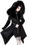 Winter long gothic coat made of soft micro suede lined with faux fur along the entire length and inside of the sleeves (100% polyester). Huge hood warmed with soft, short fur. 100% vegan. Fastened with a metal zipper, finished with a silver crescent charm