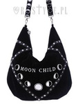 Torba wykonana z mocnego, czarnego aksamitu z dodatkami ze skóry ekologicznej. W centrum duży, biały haft faz księżyca i napisu "MOON CHILD". Długi, regulowany pasek, w całości pokryty haftem faz księżyca. Wysokość 28 cm, szerokość 44 cm. Dł. paska 120 cm