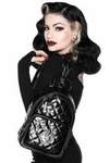 Czarna, gotycka shopperka na ramię ze skrzydłem nietoperza. Wyposażona w dwie kieszenie wewnątrz głównej komory oraz jedną mniejszą z tyłu. Sztuczna skóra i zamsz. Wysokość torby w najwyższym miejscu: 37cm, długość na dole: 26 cm, Szerokość dna: 12 cm