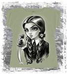 Czarna bluzka wykonana z mocnej dzianiny (100% bawełna). Obcisły fason z klasycznym dekoltem wykończonym ściągaczem. Koszulka przedstawia Wednesday Addams na trippie. Całość zwieńczona galaktyką i fazami księżyca. Koszulka dla osób w klimacie nugoth.