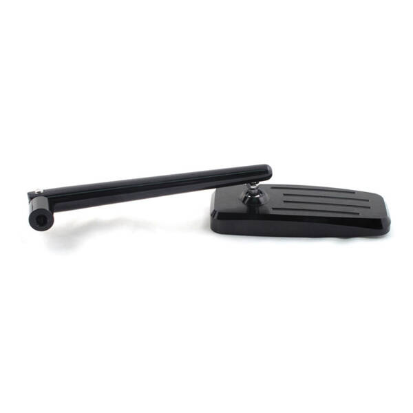 Black anodized. CNC machined aluminum with adjustable stem. Mirror stem is 8mm threaded. Comes with three 8mm to 10mm threaded studs of which one has 10mm left hand thread, the other two have 10mm right hand threads. Mirror head approx. 120mm wide x 45mm high, overall hight 155mm.