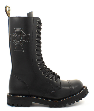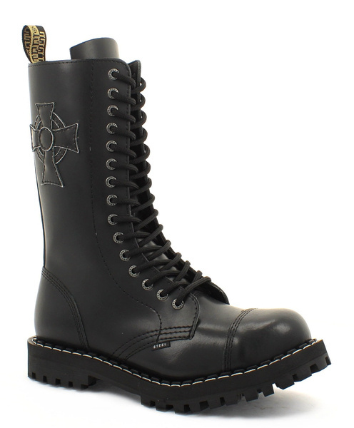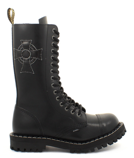 • High 15-eye BLACK CROSS boots, so called "steel caps", made of natural cowhide. Polish production. Triple seams. Screwed, rubber outsole. Steel reinforcements in the toes of the shoes. The highest quality of materials and workmanship guarantee long usage.