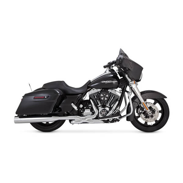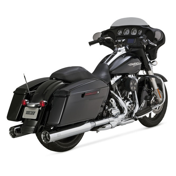 Vance & Hines slip-on mufflers. Bigger is better. At the same sound level a larger volume muffler can flow more gasses than a smaller one. The Oversized 450s come with a 4.50" outside diameter and a 2.50" perforated core fiberglass wrapped baffle. This will pass more gas and do it with a deeper rumble also. The slightly tapered and fluted CNC machined billet end-caps give it that finished look and optional end-caps are available to change the scenery. Compatible with, and great looks on, baggers with extended skirt saddlebags. The 450s are the ultimate... if you like 'em big! Note: Slip-Ons come with stock Oversized 450 end-caps, other end-caps are optionally available. Note: 565577, 564839 Titan optional end caps. Note: 565578, 565579 Destroyer optional end caps. Note: 565580, 565581 Raider optional end caps.