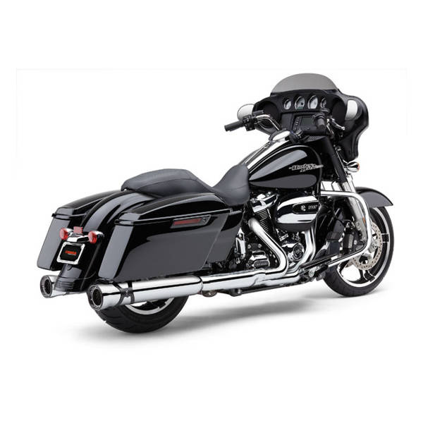 Chrome with gloss black muffler strap. Great flow & go. Internal technology is identical to the tried & proven PowrFlo and Tri-Flo mufflers. Comes with a 4" diameter body, expanding after the muffler strap, to 4 1/2". These slip-ons are an excellent choice for those that want that extra performance and a super deep sound from a traditional muffler. Destinctive styling elements, like the clamshell laser cut muffler strap, give it that little extra without becoming overkill. This one fits the traditional lines of the Harley-Davidson Touring motorcycle like a glove.