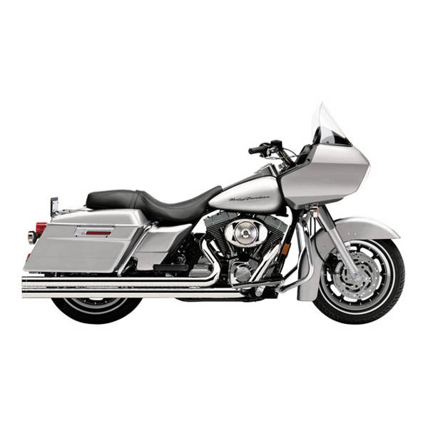 Chrome, with upgraded end tip. A classic 2 into 2 system with cutting edge features. 2 1/2" diameter, full length heat shields wrap 222° around the exhaust pipe for a virtually no-blue experience and are finished with chrome billet tips. The power port connects both mufflers for best midrange and bottom end torque and does away with the need for a balance pipe between the two exhaust headers. Since head pipes are therefore not connected you get the clean and uncluttered look. The baffles are removable and give a great deep sound. Note: Pipes extend to the end of the saddlebags. Note: A quiet baffle is optionally available as 915522, a replacement baffle as 915550.