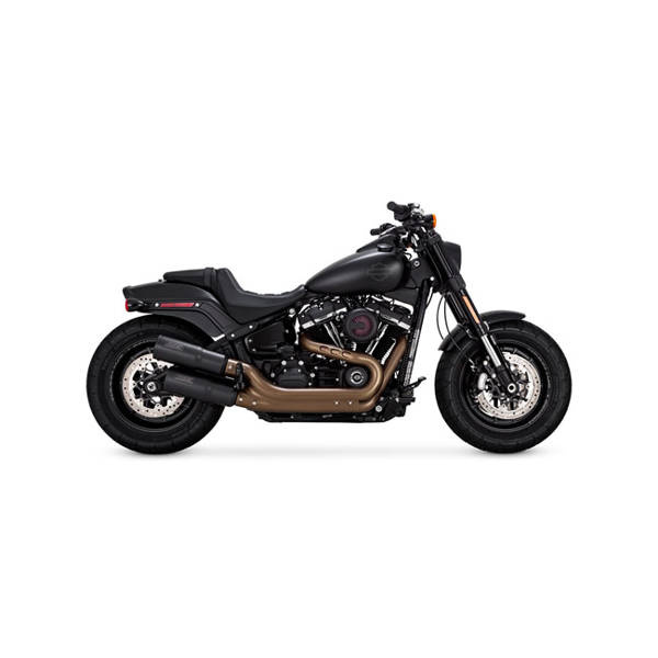 Matte black. The M8 Fat Bob looks are spectacular and its Hot Rod style deserves a matching aggressive deep tone. This stepped Hi-Output slip-on design is focused to yield maximum horsepower by improving volumetric efficiency. They will address the needs of tuned motors built for high horsepower applications, but compatibility is still excellent with stock engines. Mufflers are matte black with laser engraved riveted badges for a finished overall look. Note: See 562550 for optional quiet baffle.