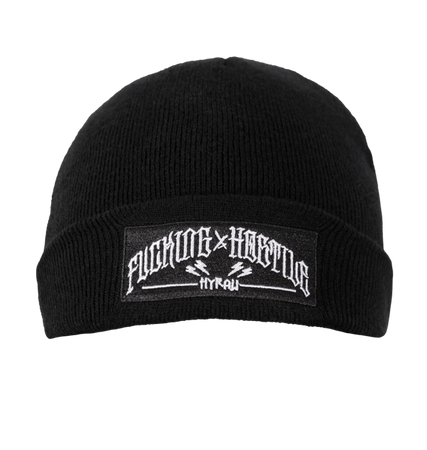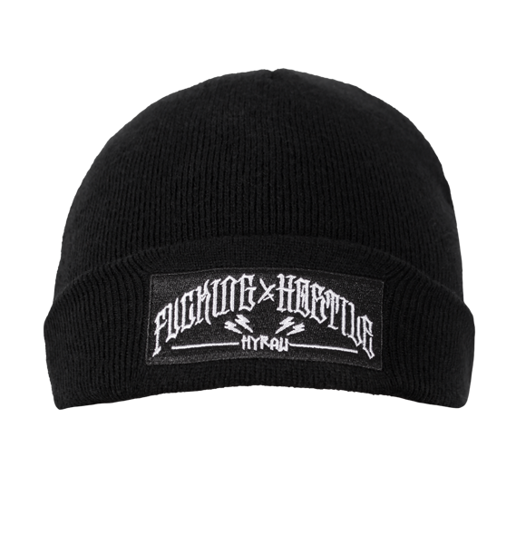 Branded beanie of the French company HYRAW. Knitted beanie with a brave patch "Fucking hostile" in the front. HYRAW rock fashion in Poland only in the metalRoute rock store.