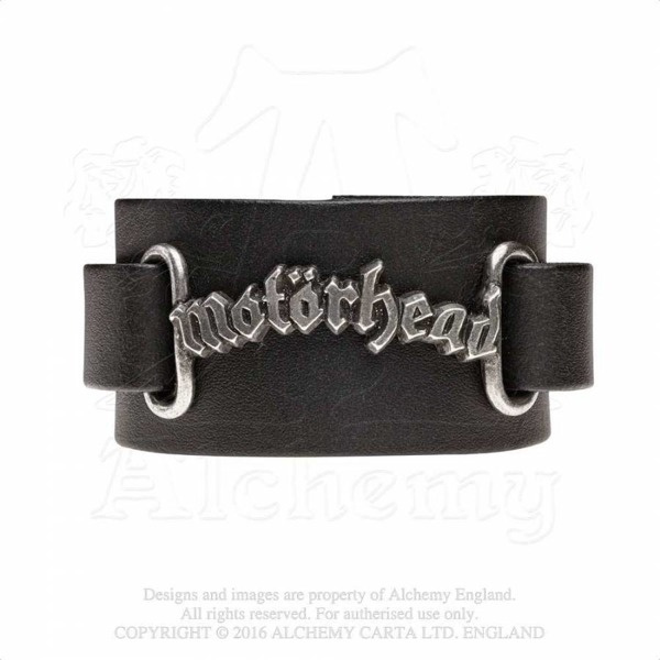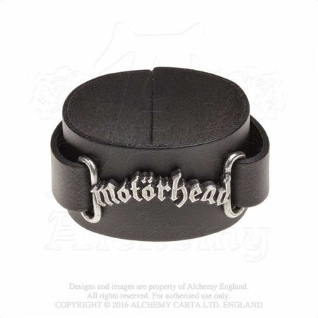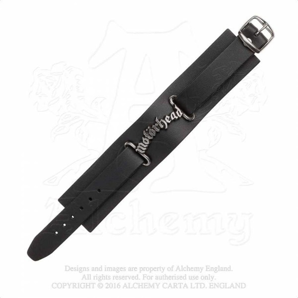 A 1 ½", (38mm) wide black leather wrist strap with a cast antiqued English pewter link-plate of the classic Motorhead logo; adjustable length, fastened with a steel buckle.