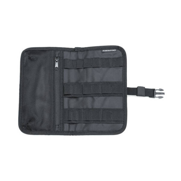 Keep the smaller items organized and easily accessible with the trunk lid organizer that mounts securely to Indian trunk lids and contains a variety of pockets for storage. Extra-secure lid-mounted snap tab attachments reinforced by high-strength hook-&-loop fasteners. Additional features include three separate storage pockets for optimum organization, a flip-out removable mirror in separate pocket and a separate MOLLE-integrated tool roll/Dopp kit. Made from durable moisture-resistant and UV-treated 1200-denier polyester.