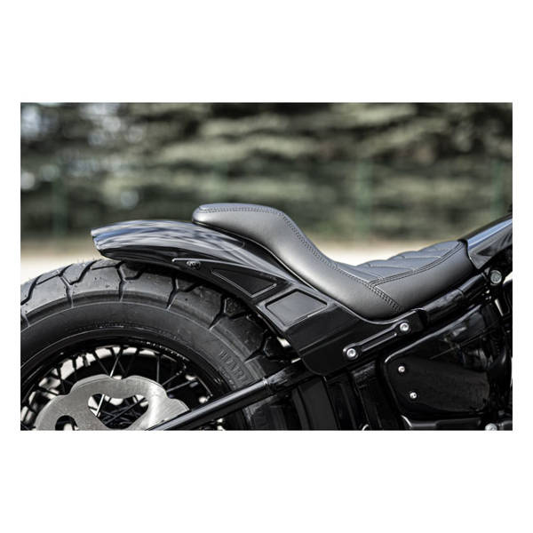Comes with black powder coated steel fender struts. This seat will carry a passenger, if needed. Parts include: Rear fender, seat pan, metal fender struts, special bolts & grommets, seat/tunnel extension, ECE approved LED taillight. The 'Bobbstr' is a short rear fender kit that will give your Softail a crazy cool power look. Compatible with the OEM solo seat. A seat pan is included for those who want to fabricate their own seat. If you feel no need to take the custom seat fabrication route, a special Killer Custom custom seat, with upholstery, is separately available as 921591 or 921592. This fender kit includes a taillight, the OEM turn signals require relocation. Made of hand-laid unpainted black gel coated fiberglass that is very stiff, strong, straight and light. Includes installation hardware and instructions. Note: All parts require fitment checks before painting and final assembly. Note: A Killer Custom seat with upholstery is separately available as 921591 or 921592. Note: Seat pan foam only, without upholstery, is available as 921594. Note: For that true Killer look, using a lowering kit, available from Killer Custom as 587888 is recommended, it offers 20mm or 30mm lowering.