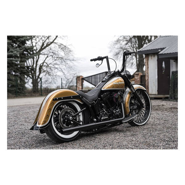 Classic pre-drilled FL style fender with a noticeable 4" (10cm) stretch at the rear for a Killer Custom low ride impression, even without a lowering kit. The old school classic trim tip gives the bike the laid back vintage look for the latest Softails. Made of hand-laid unpainted black gel coated fiberglass that is very stiff, strong, straight and light. Note: All parts require fitment checks before painting and final assembly.