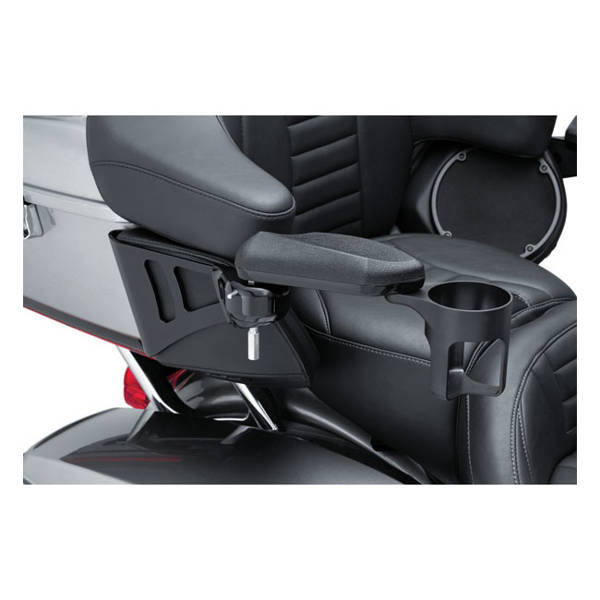 Can be adjusted vertically and rotated out of the way when passenger gets on or off, or even removed, with the push of a button. Mounting bracket is installed between the Tour-Pak and speaker housing. Includes one cup holder.