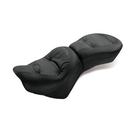 A plain touring seat with 18" wide rider area and 16,5" wide passenger area. The Standard Touring platform features several design improvements over the stock seat. A deeply pocketed driver bucket sits you in the ideal cruising angle at a similar reach to the controls compared to stock. The driver's back is well supported by the nose of the passenger seat that extends forward to create a full high backrest.