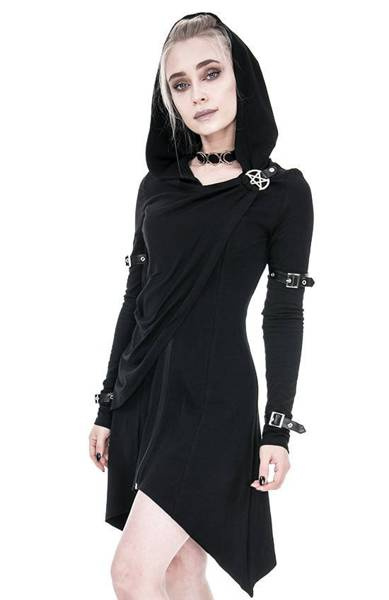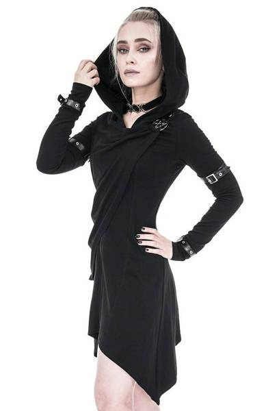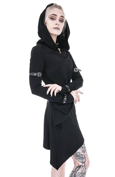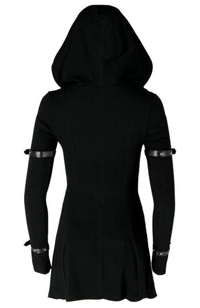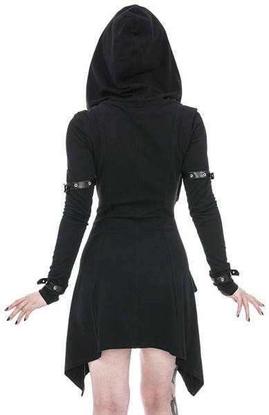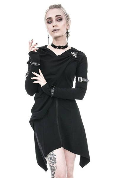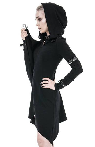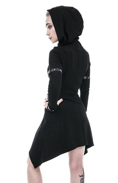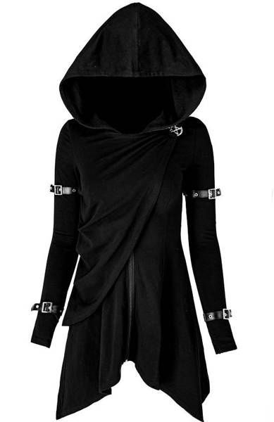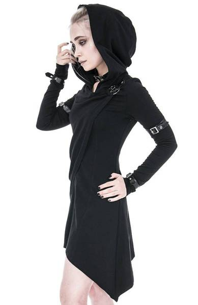 The draped gothic sweatshirt has an asymmetrical cut - flared at the hips and fitted at the waist. Therefore, it will be perfect if you like to dress informally, but have your shapes emphasized. You can use the practical hood when you need a bit of intimacy or, of course, to protect yourself from rain.