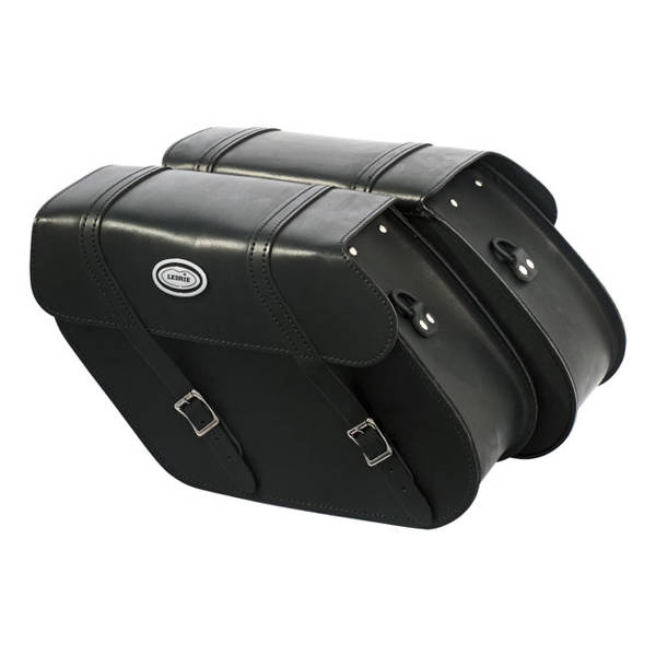 17 liter per bag. Dimensions per bag: 43cm long x 16cm wide x 26cm high. Manufactured from premium quality 2.8mm thick split leather. All saddlebags, side bags and sissy bar bags come with a 4mm thick HDPE (polyethylene thermoplastic) back panel, unless mentioned otherwise. This is same material of which, for instance, kayaks are made, to ensure maximum strength & shape retention under harsh conditions. The reinforcing plate is sewn onto the leather, giving it excellent strength and great universal mounting options. A special groove is cut into the HDPE back plate, allowing for lowered stitching in the groove, below the surface of the back plate. This protects stitching from abrasion. All bags are pre-treated with a special oil for maximum life and water resistance. All bags are hand-made by experienced personnel to ensure a continuous high quality standard. Mounting note: These saddlebags can be used with the 559467 universal Ledrie saddlebag carrier set or with the 55946 Ledrie universal saddlebag support bracket. Since motorcycle specific application and rider preference differs no hardware is included and no provisions are made to mount the saddlebag to saddlebag carrier. Holes can be drilled in the reinforced rear section of the saddlebag, at the desired point and installed to the universal carrier frame, which must be ordered separately, or custom made. Many riders prefer a simple but effective installation to the carrier with some sturdy cable straps. Mounting note: Model specific hardware kits are available as 559463 for 91-03 Sportster, 559464 for 04-13 Sportster, 559465 for 86-17 Softail; 96-17 Dyna (excl. FLD); 14-20 Sportster. Note: 559457 turn signal relocation kit is available for 96-17 Dyna (excl. FLD Switchback models). Note: Dimensions and capacity are approximate and for reference only.