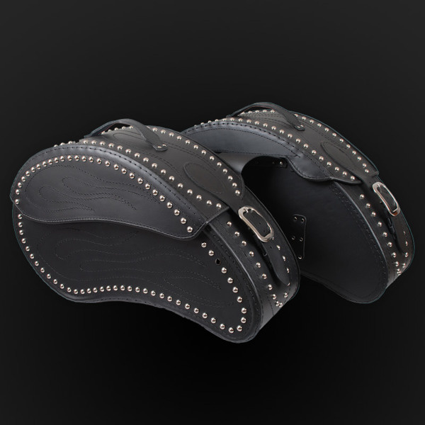 • Leather motorcycle saddlebags. Made of high quality cowhide. Fastener with leather straps. Length 57 cm, height 34 cm, width 19 cm. Decorated with stainless steel studs. Leather mounting straps are included.