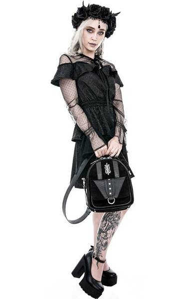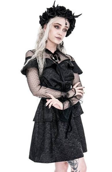 A gothic dress will emphasize the advantages of your figure, but won’t reveal too much. You can tie the stand-up collar at the very neck with a long, black ribbon. You don't need to choose jewelry for the dress, because the neckline is decorated with a silver crescent.