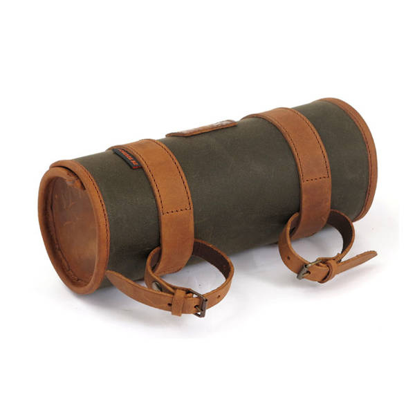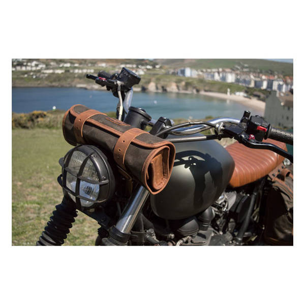 Universal motorcycle tool roll. In CLASSIC style. Dimensions: 26cm x 10.5cm. Made from waxed cotton canvas and finished with oiled ranger leather.