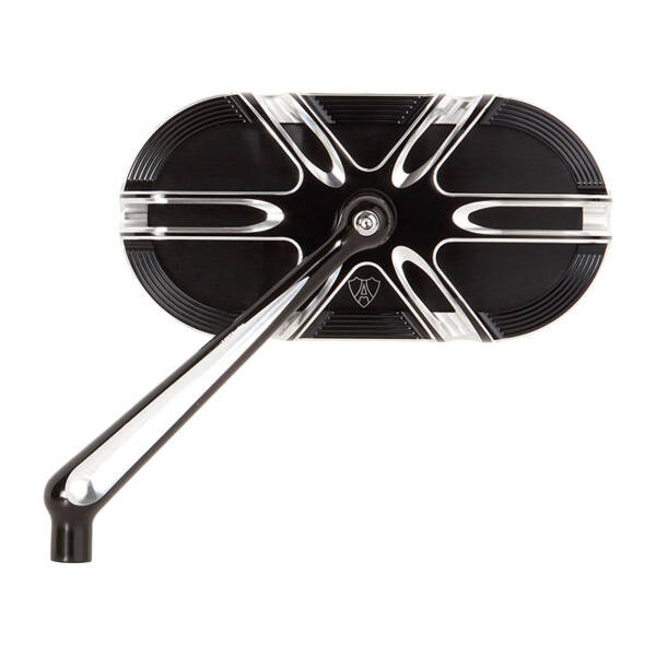 Another great example of why Arlen Ness still hovers above the rest, after half a century of customizing. Forged aluminum multi-parts open 3-D design mirror with stainless pivot hardware. Dimensions 5.45" wide x 2.5" tall. Black anodized