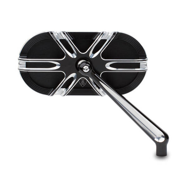 Another great example of why Arlen Ness still hovers above the rest, after half a century of customizing. Forged aluminum multi-parts open 3-D design mirror with stainless pivot hardware. Dimensions 5.45" wide x 2.5" tall. Black anodized
