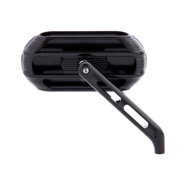 Another great example of why Arlen Ness still hovers above the rest, after half a century of customizing. Forged aluminum multi-parts open 3-D design mirror with stainless pivot hardware. Dimensions 5.45" wide x 2.5" tall. Black contrast machined.
