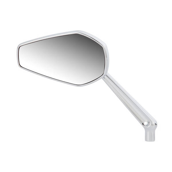 Chrome plated. Billet aluminum with both head and stem forged into the right combination of straight and flowing design. Small enough to not stand out, large enough for an adequate rear view. Mirror head pivots on a heavy duty stainless hardware. Includes mounting hardware for H-D, Indian and Metric applications. Overall mirror head dimensions: 4.5" (11.4cm) wide x 2.74" (7cm) high.