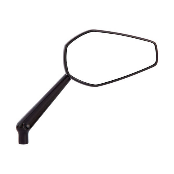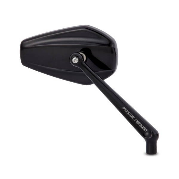 Black anodized. Billet aluminum with both head and stem forged into the right combination of straight and flowing design. Small enough to not stand out, large enough for an adequate rear view. Mirror head pivots on a heavy duty stainless hardware. Includes mounting hardware for H-D, Indian and Metric applications. Overall mirror head dimensions: 4.5" (11.4cm) wide x 2.74" (7cm) high.