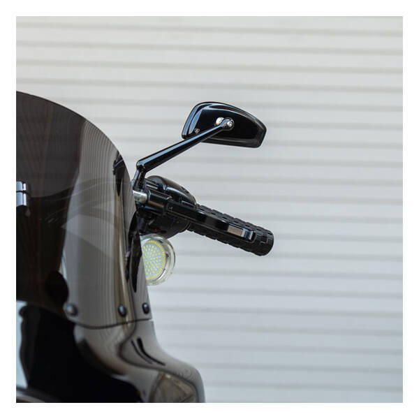 All black anodized finish. Left side. We all know the classic Teardrop, but this is different. The Tearchop is a CNC machined forged aluminum mirror that has been modified on all the right places, but still provides a good field of view. The 3-D sculpting result gives it a sleek and improved look especially on contemporary bikes. Comes with stainless internal pivot hardware for durability, the laser engraved Arlen Ness logo is the seal of approval for all customizers, mellow to radical. Includes installation hardware for Harley, Indian, Victory and metric bikes.