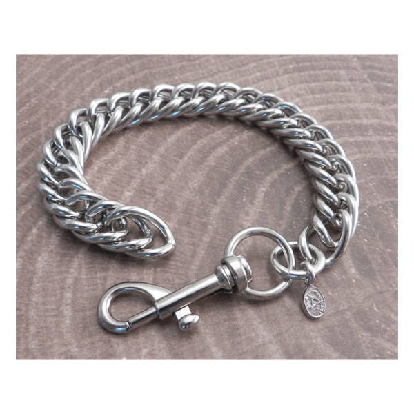 • Heavy bracelet with a guarantee of the highest world-class quality. AMIGAZ-a global brand. Made in USA. Silver. Chrome-plated steel. Total length 8". Chain links 3/4" lenght by 1/2" width. With hinge clasp closure.
