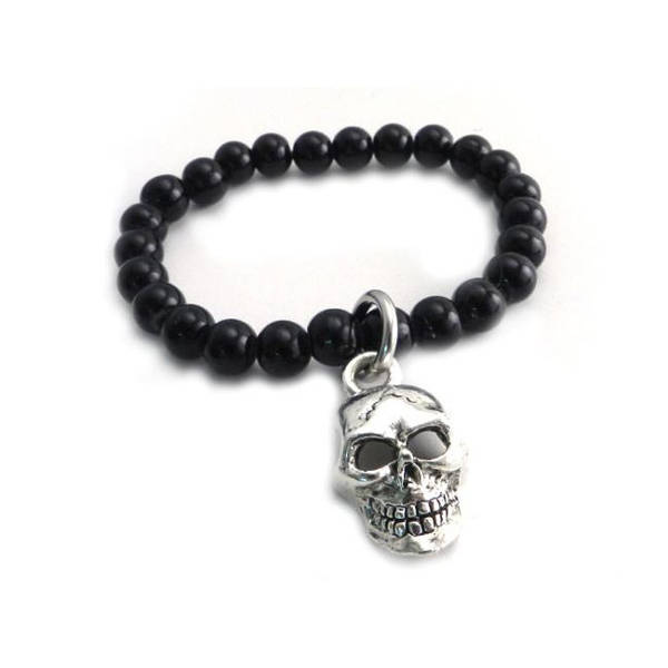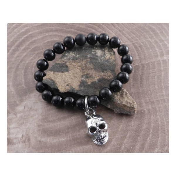 Bracelet with a guarantee of the highest world-class quality. AMIGAZ-a global brand. Made in USA. Black. With 1-1/4" x 3/4" skull XL, 8mm black glass beads.