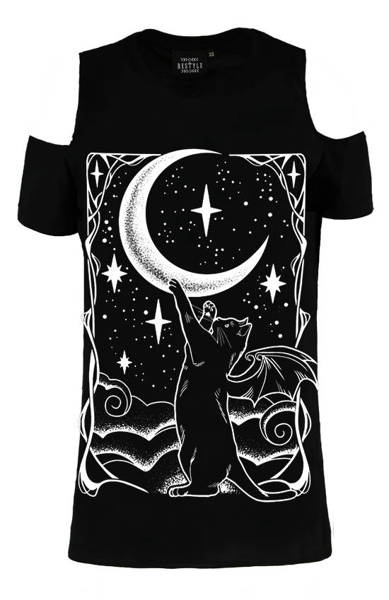 The cat and moon motifs have always fascinated. It is associated with magic, esotericism and mystery. The pattern on the black women's Cat Crescent Cold Shoulder T-Shirt evokes these associations.