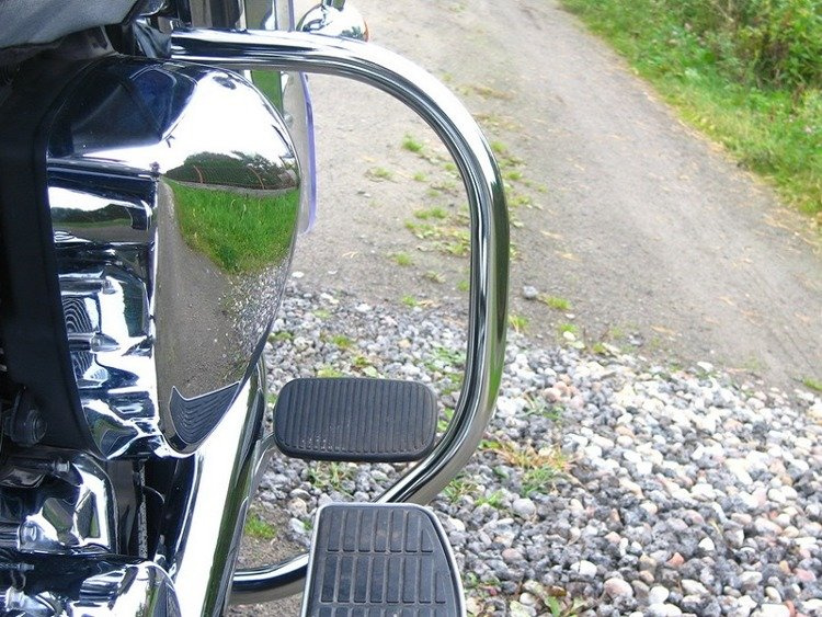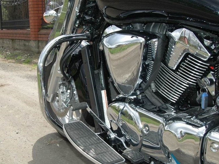 Classic chromed front engine guards. EXTRA version with grinding welds and joints. Galvanic cover: copper, nickel, chrome. Made of precision steel pipe: Ø 32 mm, thickness 2.5 mm. Width ~80 cm. One-piece construction. Mounting screws included.
