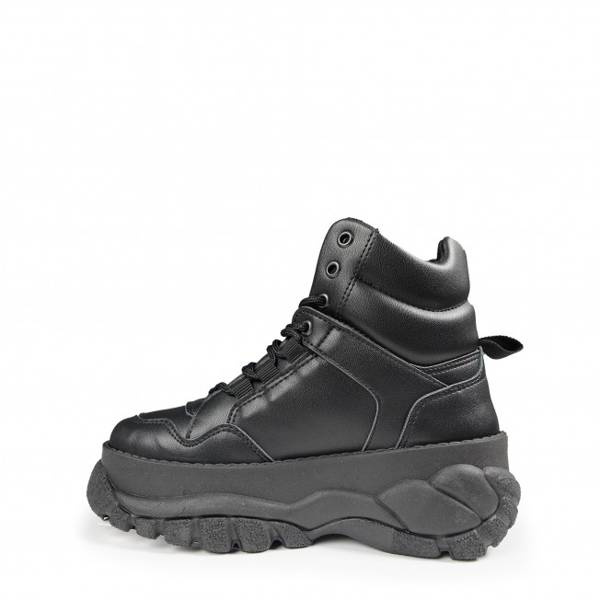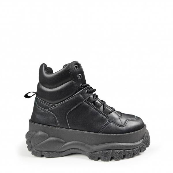 • Black feminine platform shoes made of high quality vegan leather. The sole hight 6 cm (front-back). Polish production. The highest quality of materials and workmanship guarantee long and comfortable usage.