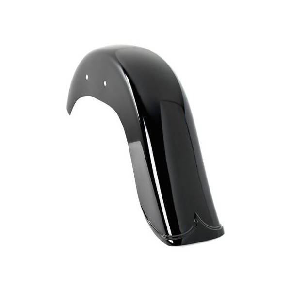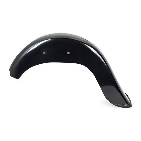 Classic pre-drilled FL style fender with a noticeable 4" (10cm) stretch at the rear for a Killer Custom low ride impression, even without a lowering kit. The old school classic trim tip gives the bike the laid back vintage look for the latest Softails. Made of hand-laid unpainted black gel coated fiberglass that is very stiff, strong, straight and light. - Will fit with original fender struts and seat. Note: All parts require fitment checks before painting and final assembly.