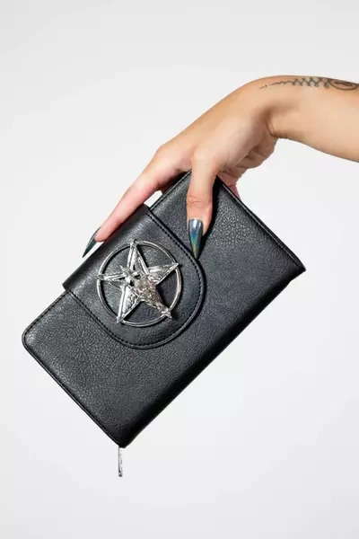 • 'Doom Raider' wallet; made of faux leather. Popper closure with metal baphomet pendant. Detachable wrist strap. Zip closure pocket with additional zip coin pocket. Multiple card slots and windowed card slot. With Killstar Branding, 100% PU.