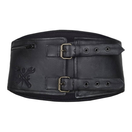 Motorcycle kidney belt. American brand belt JOHN DOE. Made from bovine leather with a thickness of 1,1mm. On the back is the John Doe classic logo embroidered. With 2 adjustable tabs. On the waist are stretch lips and an outside pocket closed with zipper