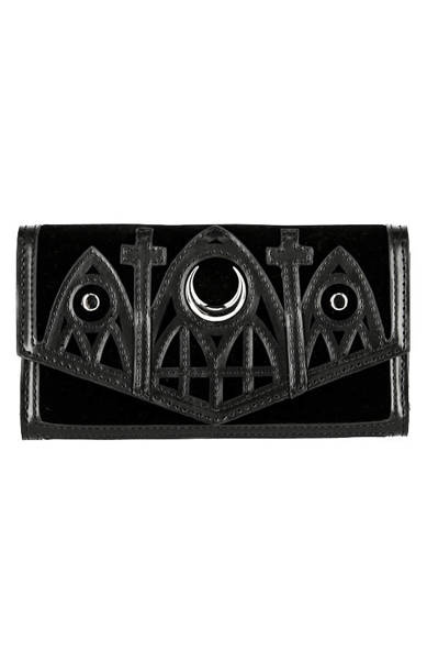 a gothic wallet with a cathedral motif, decorated with a silver moon.