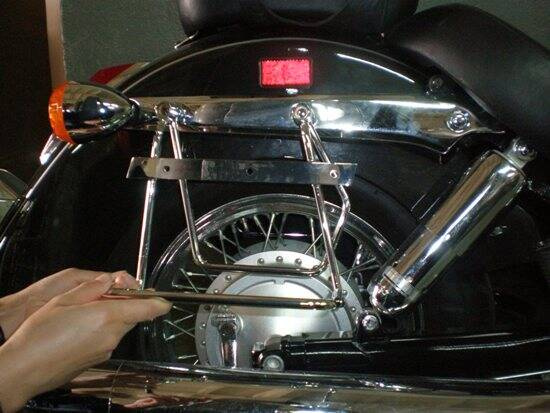 • Chrome saddlebag support rails for HONDA Shadow VT750 C4/5 RC50. Hangers with props for saddlebags. Made of steel chrome profile. Galvanic coating: copper, nickel, chrome. Set of both left + right saddlebag support rails and mounting screws.