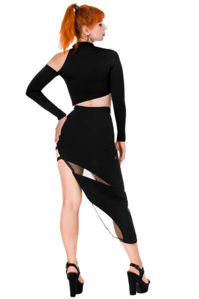 Introducing the DELANEY asymmetric high waist skirt. The unique translucent cutouts give the skirt an extraordinary gothic flair. The icing on the cake are the two thigh stripes that catch the eye. In addition, they have elastic elements, thanks to which they don't restrict movement. You'll find another original cutout on the hip. Both the shape of the skirt and the arrangement of cutouts and straps emphasize feminine shapes, directing the eye to the right places of the silhouette.