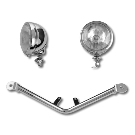 • Chrome lightbar with two lamps (12V, 4,5 inch H3 55W) for KAWASAKI VN 900 Vulcan Classic. Made of steel chrome profile. Galvanic coating: copper, nickel, chrome. Thick and solid attachment to prevent tremors. Without electric cables and turn signals
