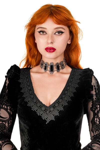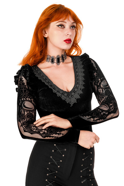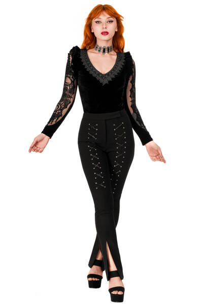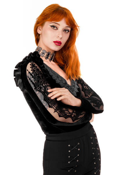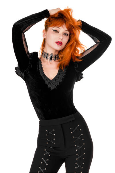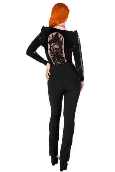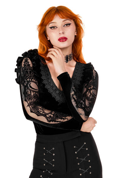 Crafted from soft velvet, the bodysuit features a triangular neckline adorned with intricately embellished lace trim. Sleeves are adorned with inserted mesh fabric, depicting cathedral motifs and moons in an elegant flocking pattern. The bottom is adjustable with three rows of hooks.